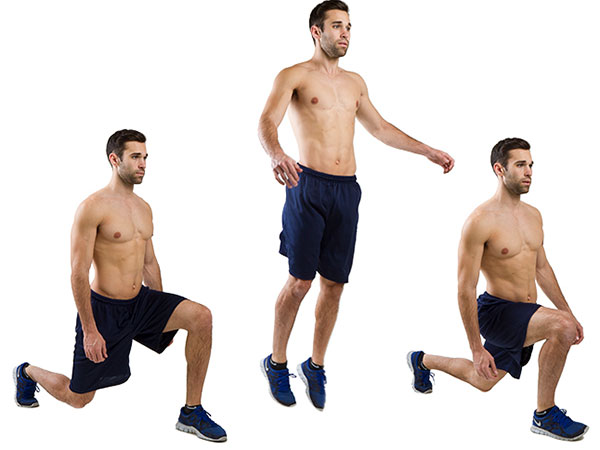 เริ่มฝึกท่านี้ด้วยการยืนตัวตรง โดยก้าวเท้าซ้ายไปข้างหน้าและถอยเท้าขวาไปด้านหลัง จากนั้นให้ย่อตัวลงไปจนเข่าสัมผัสพื้น กระโดดขึ้นและสลับเท้าในจังหวะเดียวกัน ทำให้ครบ 10 ครั้งต่อเซต ทั้งหมด 3 เซต - Glute Hamstring Raise