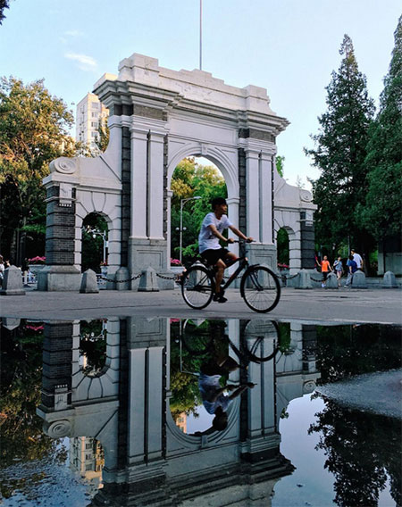 มองหาจุดที่มีน้ำขังตามถนน ที่จะให้เงาสะท้อนของสิ่งก่อสร้างบริเวณนั้น หรือให้ตัวแบบไปยืนด้านหน้าของแอ่งน้ำก็ได้ โดยเงาสะท้อนจากน้ำจะช่วยให้ได้ภาพถ่ายในมุมสวย ๆ ซึ่งเป็นมุมที่หาได้ยากกว่าเมื่อเทียบกับฤดูอื่น ๆ