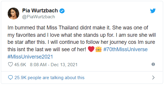 ปิอา เวิร์ตซแบช (Pia Wurtzbach) ปัจจุบันอายุ 32 ปี เป็นนางแบบ นักแสดง และนางงาม ลูกครึ่งฟิลิปปินส์-เยอรมัน เจ้าของตำแหน่งมิสยูนิเวิร์ส ประจำปี 2015 (Miss Universe 2015) ล่าสุด ออกมาทวีตแสดงความผิดหวัง หลัง แอนชิลี สก๊อต-เคมมิส มิสยูนิเวิร์สไทยแลนด์ 2021 ไม่สามารถผ่านเข้ารอบมิสยูนิเวิร์ส 2021 รอบ 16 คนสุดท้ายได้ พร้อมให้กำลังใจต่อไป