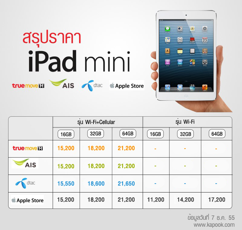 ล่าสุดค่ายมือถือ AIS, TrueMove H และ Dtac วางจำหน่าย iPad mini อย่างเป็นทางการแล้ว ซึ่งราคา iPad mini รุ่น Wi-Fi+Cellular ของ AIS และ TrueMove H มีราคาเท่ากับที่วางขายอยู่บน Apple Store Online ส่วนราคาของ Dtac มีราคาสูงกว่าเล็กน้อย ติดตามราคาทั้งหมดได้จากด้านล่าง